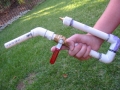 A minor problem encountered was that I wanted the valve to be on the handle portion of the cannon, which meant that between the valve and barrel there would have to be a 45ยบ turn. To prevent any potato from getting stuck in this elbow, I put a stopper in it consisting of a hole drilled through the pipe with a nail driven through it and with both ends of the nail filed off. The result is that there is a piece of metal in the back of the barrel which effectively does its intended job.