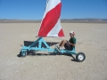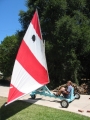 Boat on wheels or Go-kart with a sail? You decide. Either way, the concept is the same. It is a craft with both wheels and a sail. The sail is controlled by a rope like on a boat, while steering is done by turning a steering bar with the feet.