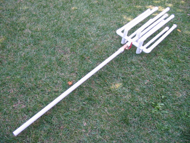 This is a very powerful shoulder-fired potato cannon, comparable to combustion-powered potato cannons. The purpose of the array of small pipes is to acheive high tank volume while preserving the high pressure capabilities of smaller pipe. This mess of pipe has earned this cannon the nickname "The Pitchfork of Doom."
